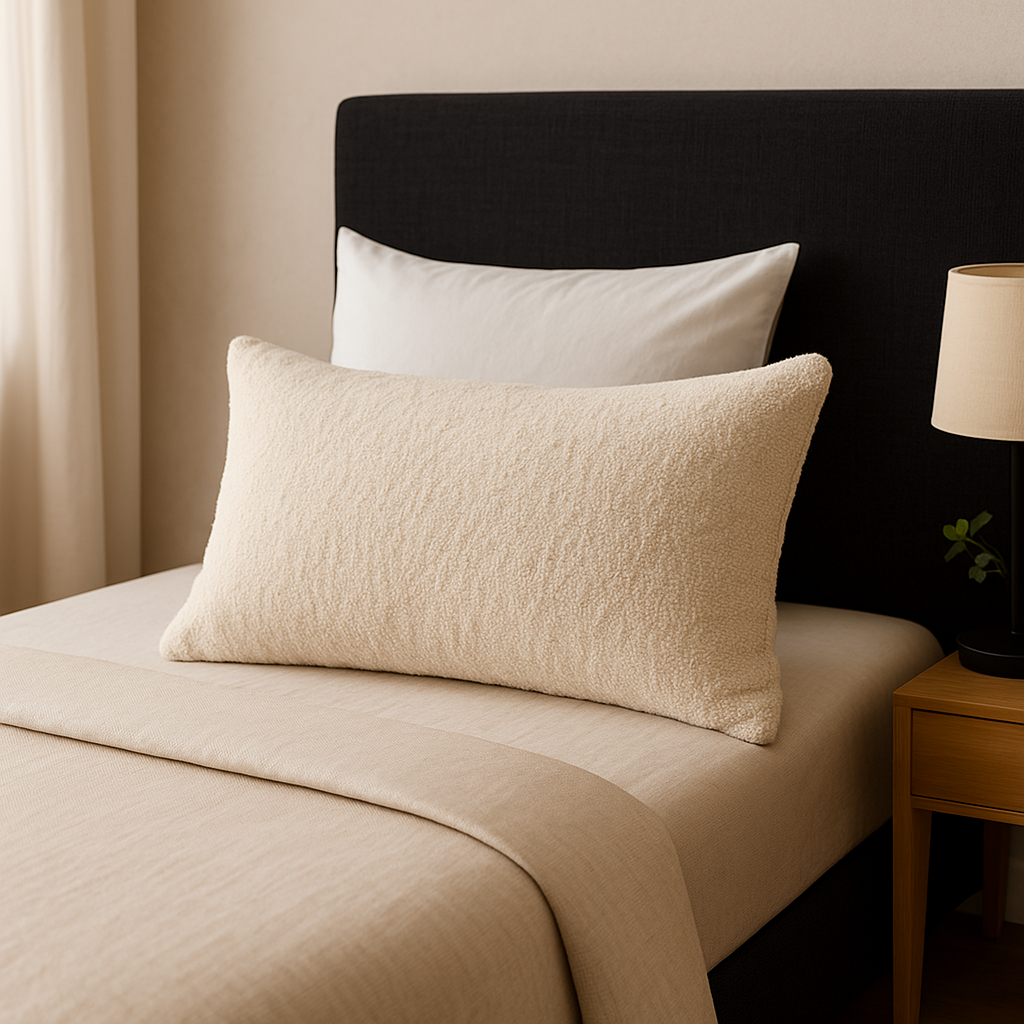 Abraza la tendencia con el Cojín Bouclé Crema Suave. Medida: 40x60cm lumbar. Material: Bouclé de poliéster premium. Color: Crema natural cálido. Relleno: Fibra hueca siliconada.