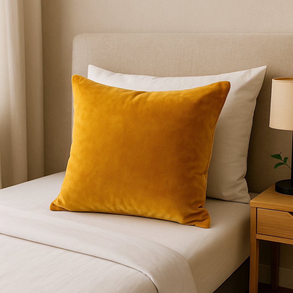 Cojín decorativo en terciopelo mostaza. Toque de color para espacios minimalistas.