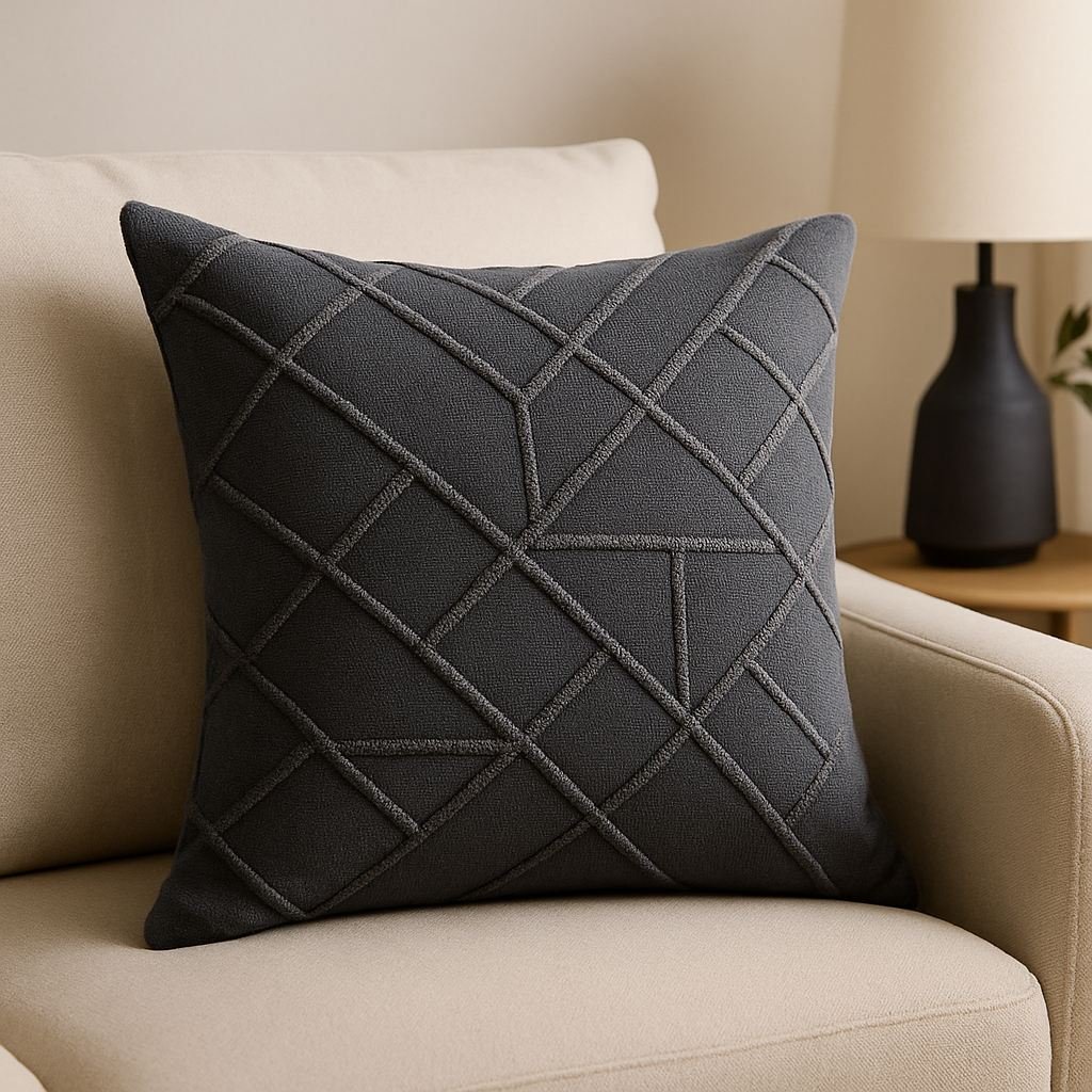 Cojín con patrón geométrico en gris carbón. Diseño moderno para espacios contemporáneos.