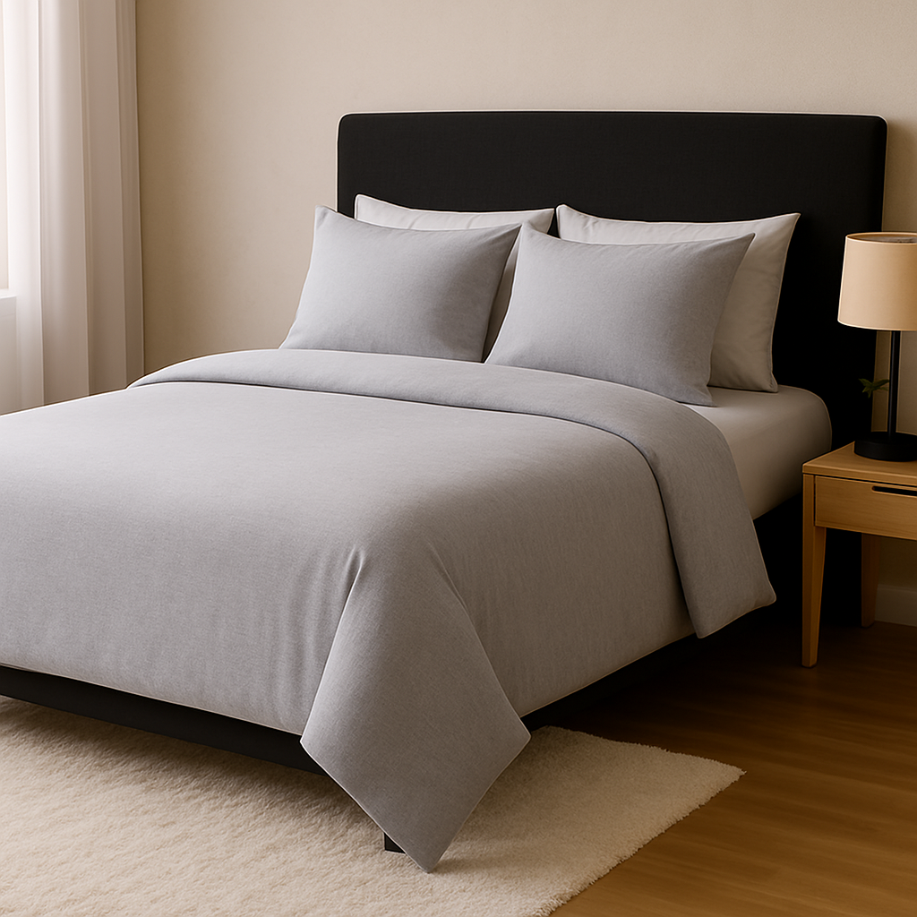 Sábanas en gris perla con tejido suave. Diseño sofisticado para habitaciones contemporáneas.